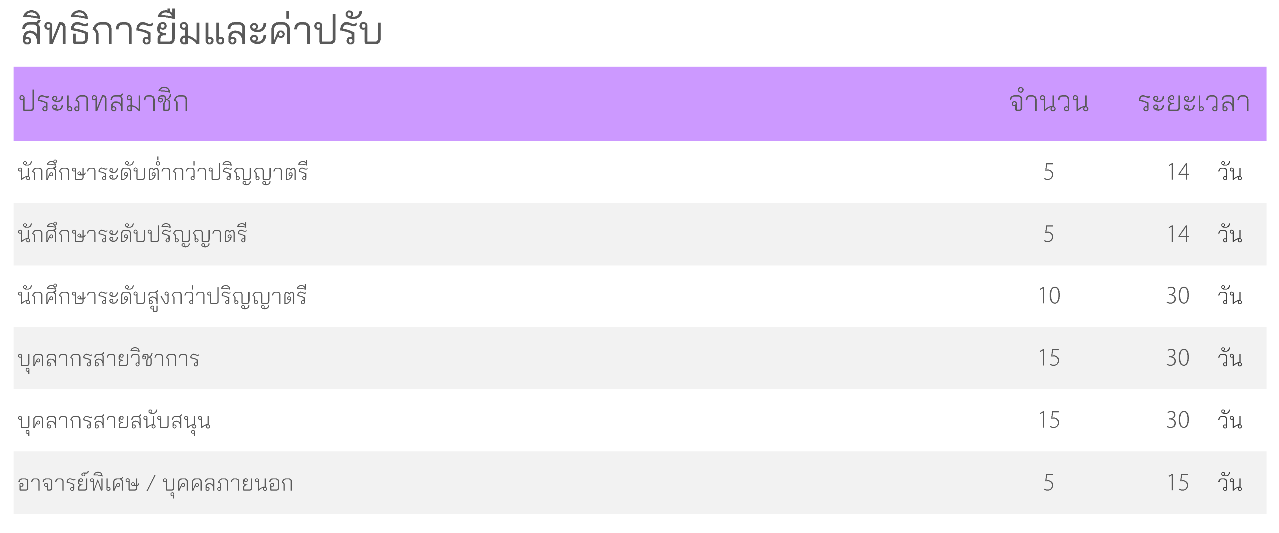 สมาชิกสามารถยืมหนังสือได้ตามสิทธิการยืม ดังนี้